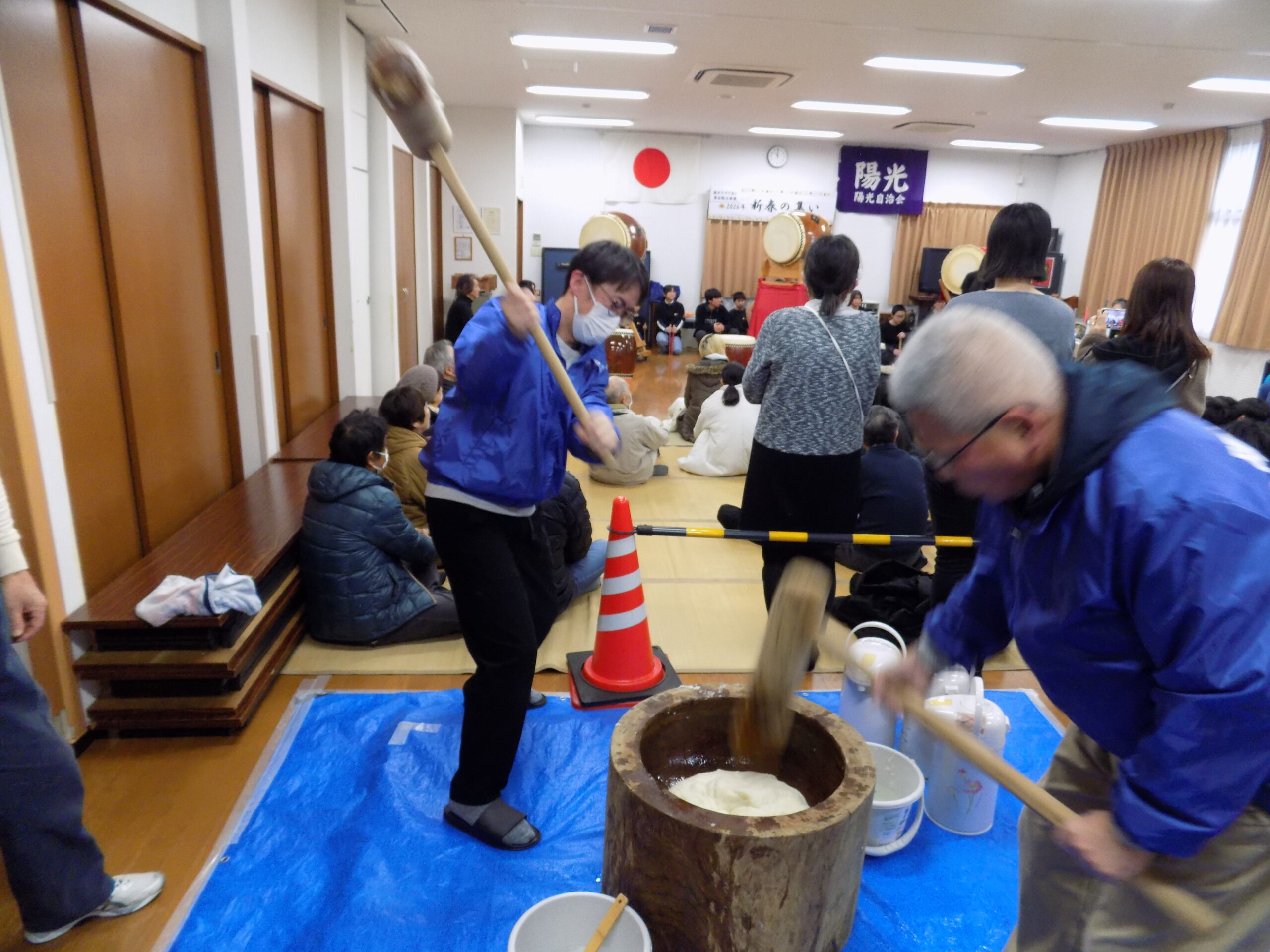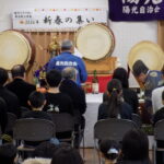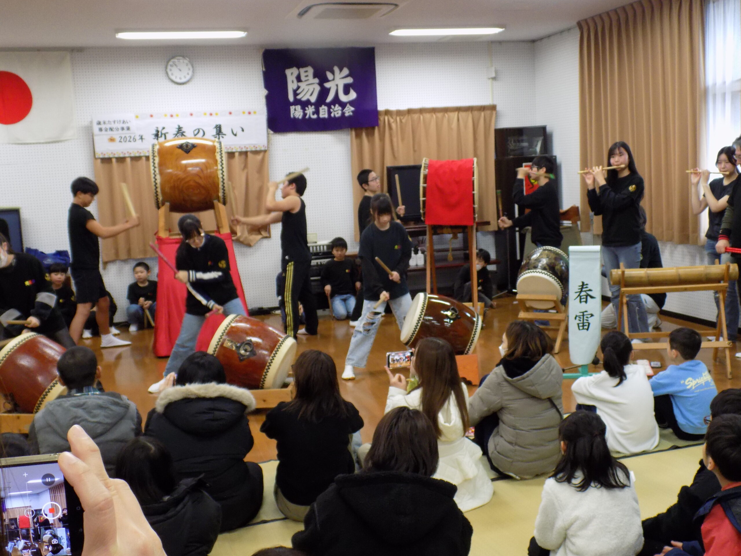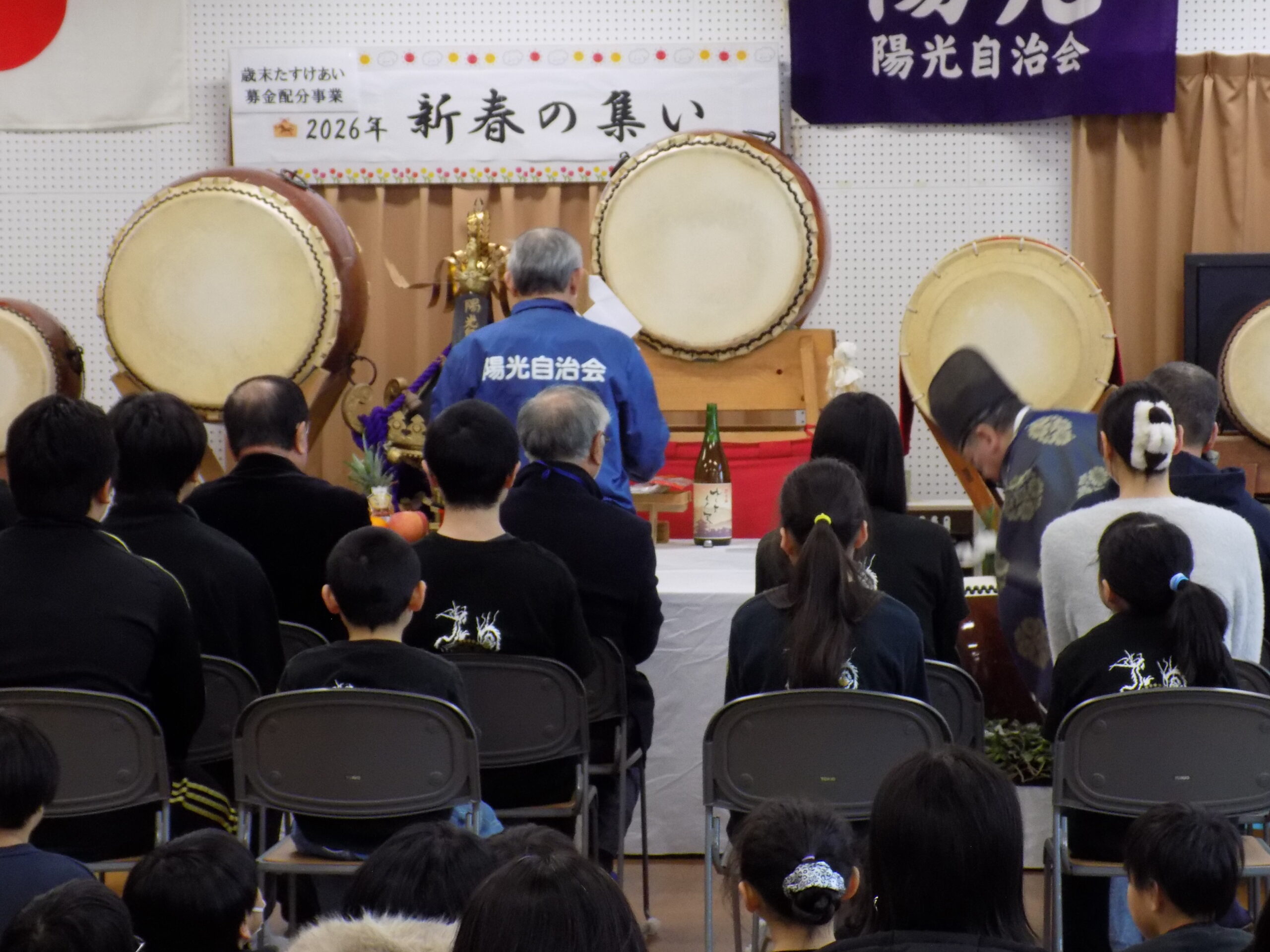 自治会の安全祈願の後、陽光太鼓光龍会の打ち始めで活気づいた中、集いが始まりました。